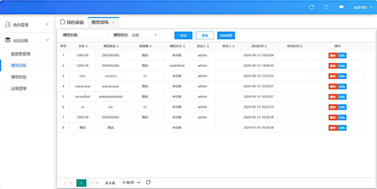 支持创建一个新的模型,从而绑定数据集进行AI训练;支持将训练好的模型进行web端发布;支持对各种算法模型的统一管理与版本管理