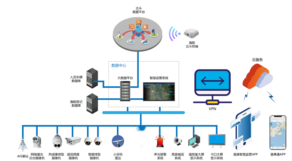 电子围栏:系统可以通过设置多种方式电子围栏,对船只违规闯入游艇区等行为,采用主动识别(视频、雷达)、被动识别(船舶终端AIS)多种方式融合判断,告警通知渔港管理人员进行处理。